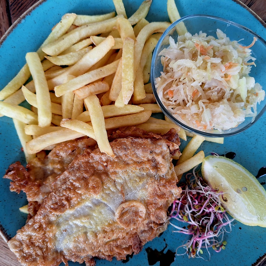 FLĄDRA PO PARYSKU CENA – 43,00 PLN Dwa fileciki z flądry w panierce z jajka, po parysku. Podane z frytkami i surówką z kiszonej kapusty. Allergeny: jaja